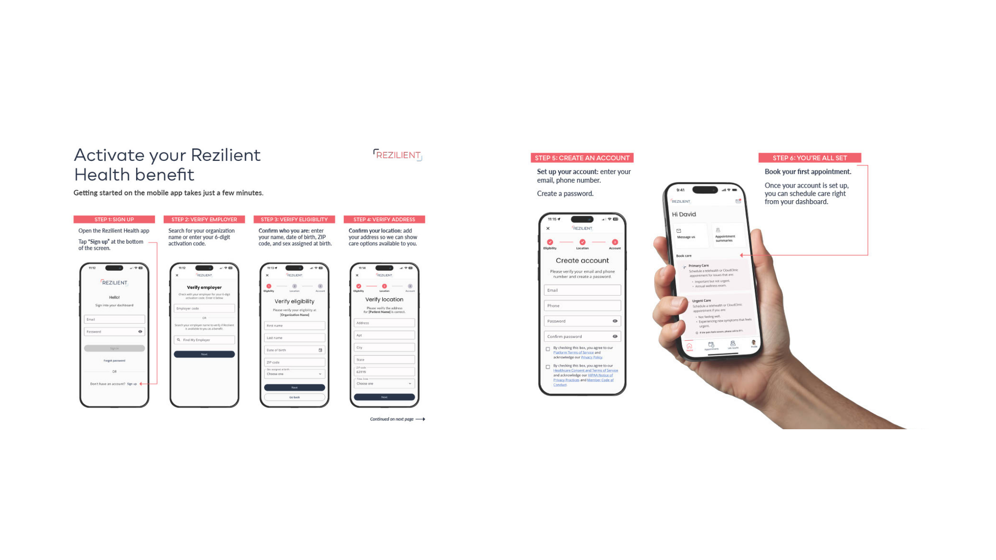 Getting started takes just a few minutes. You can download the Rezilient Health app from the App Store or Google Play and follow the steps below.